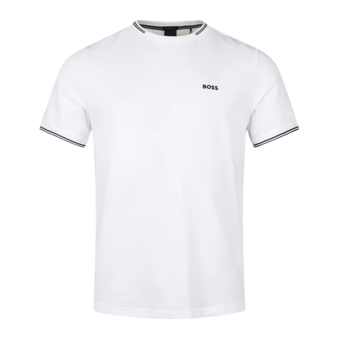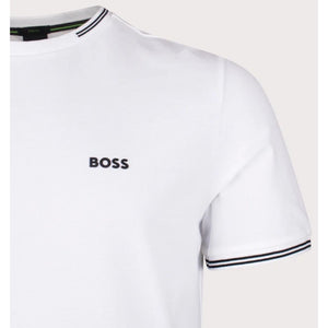 The BOSS Taul T-Shirt combines understated sophistication with everyday practicality. Made from a soft cotton-rich fabric, this regular-fit essential features a timeless crew neck and short sleeves perfect for year-round wear. The crisp white base is enhanced by striking black contrast trims along the collar and cuffs, creating a polished aesthetic. Signature BOSS branding on the chest completes the refined look, making it an ideal foundation piece for any wardrobe.