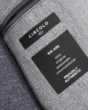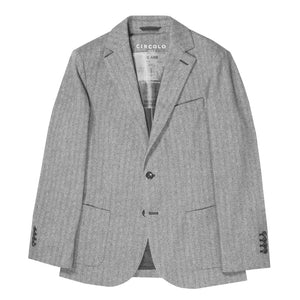 This Circolo blazer is a luxurious grey cotton blend herringbone jacket. It features a classic notched collar, a chest patch pocket, and a front button fastening. The jacket has long sleeves with buttoned cuffs, two front patch pockets, English rear vents, and a straight hem. A timeless and refined item, perfect for any special occasion.