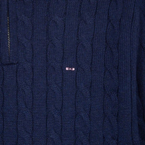 With its zipped stand-up collar and cable knit, this pure cotton sweater has a very trendy preppy look. Its careful finishing and knitting work give depth to this piece designed to combine comfort and elegance all day long. Available in 4 timeless colours: beige, navy, grey or brown, this cable knit sweater is a must-have in any man's wardrobe, to be worn alone or layered over a shirt. Regular straight fit. Zip-up trucker collar with logo slider. Flat ribbed collar edge. Cable stitches and flat rib. Bow tie chest embroidery. Ribbed finishes.