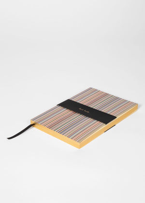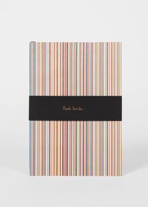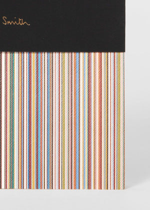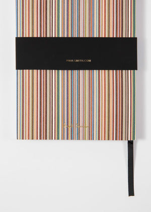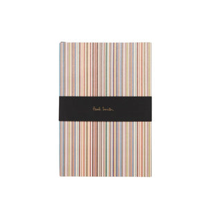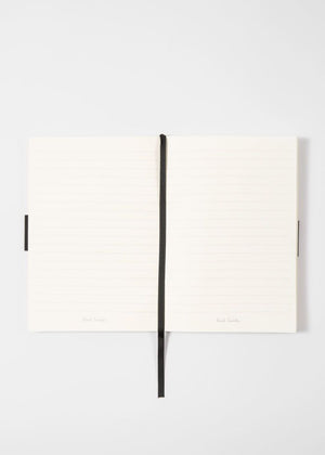 This lined paperback notebook features a Paul Smith signature page footer, black ribbon marker and gold-foil page edging. This classic notebook is finished with a bold, removable black paper card slip across the centre exterior, finished with a gold Paul Smith signature.