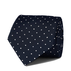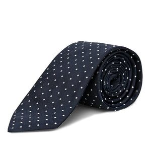 Elevate your style with the Boss Mini Polk Dot Silk Tie in navy. Made with a luxurious blend of silk and polyester, this tie features a classic polka dot design that adds a touch of sophistication to any outfit. Perfect for both formal and casual occasions, this tie is a versatile addition to any wardrobe.