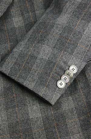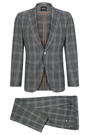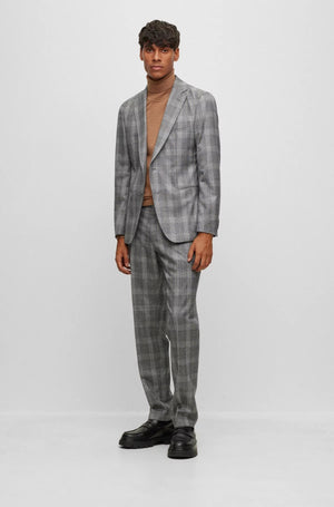 This grey Hugo Boss check suit is made of 100% virgin wool and is designed with a slim fit and plain check. Its high-quality fabric ensures resilience and comfort, making it perfect for any occasion.