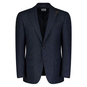 This jacket features a regular fit in a deep evening blue shade. It includes a single breast pocket and is crafted from a blend of 62% wool, 18% polyamide, 10% silk, 8% polyester, and 2% elastane. The navy fleck blazer offers a refined and structured look suitable for formal occasions.