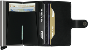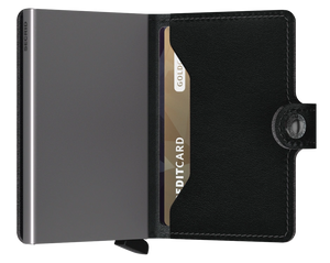Small in size and surprisingly large in storage capacity, the Miniwallet combines the best of both worlds. The exterior holds banknotes, receipt and cards, while the aluminium Cardprotector allows you to slide out cards with one simple motion and protects them from bending, breaking and unwanted wireless communication.