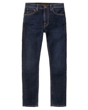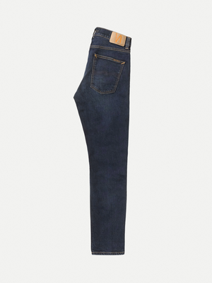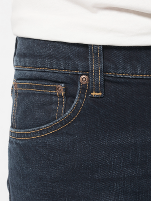 Slim fit jeans with a tapered leg made in organic comfort stretch denim. A lovely pair of deeply dark indigo jeans with subtle abrasions and slightly contrasting wear marks. The denim used for these jeans has a slightly special making; the warp yarns are dyed to an intense indigo tone, whereas the weft yarns, usually kept white, are dyed black. It is this somewhat unconventional making of the denim that gives these jeans their outstanding ink-like hue.