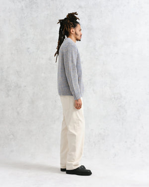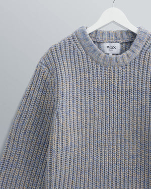 Our existing Wilde crew neck shape makes an exciting return for AW24. This heavyweight knit is cut with a relaxed fit and is constructed from a thick twisted wool blend yarn to create this blue textured design. It features a double-layer ribbed neckband and a ribbed hem and cuffs.