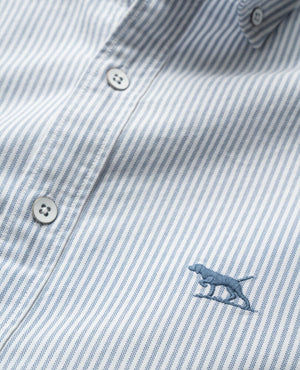 Gunn Oxford Stripe-Horizon. Stripes mean business, and nothing is quite as versatile and assured as the classic bengal stripe. This version is milled in a perennial oxford fabric, which was prestigiously milled in Italy. Its washed 2-ply construction creates a soft, broken-in feel that will continue to soften over time with washing and wear.