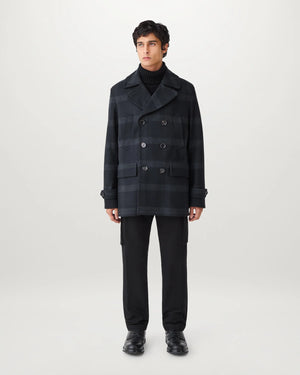 The Milford peacoat in Dark Charcoal. This wool and cashmere blend style is a military-inspired design with officer class. The belted, double-breasted coat is crafted from black virgin Melton wool – equally at home over a suit or pair of selvedge jeans. A style with quiet authority for life’s front line.