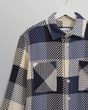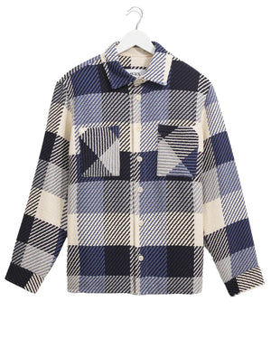 The Wax signature piece. The Whiting, our year-round staple, returns in a new large block check woven design that mixes navy, pale blue and ecru yarns. This fabric is made sustainably by a family-run French mill using recycled cotton to create an effortlessly wearable overshirt that combines timeless style with responsible craftsmanship. Is it a shirt? Is it a mid-layer? Is it a jacket? It's all of those things and much, much more.