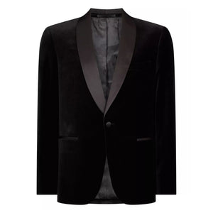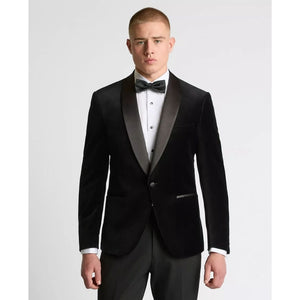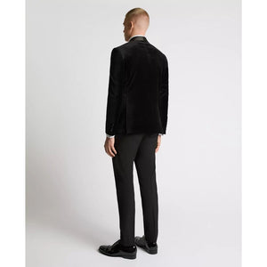When the invite says black tie, this is how you do it. This slim fit velvet jacket brings instant polish with a hit of attitude. Pair with a crisp white shirt, step in, and own the room.- Crafted from cotton stretch fabric- Single-breasted with side vents- Satin jetted pockets- Satin button detailing