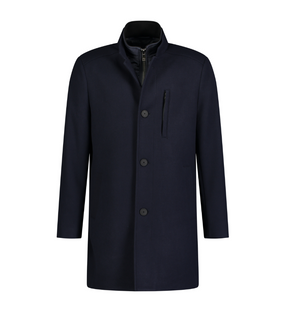 This navy wool coat features a sophisticated dark blue shade (color code A401). The outer fabric blends 70% polyester, 28% viscose, and 2% elastane for durability and comfort, complemented by an additional 100% polyester outer layer. The lining is crafted entirely from polyester, ensuring a smooth finish. A refined choice for stylish outerwear.
