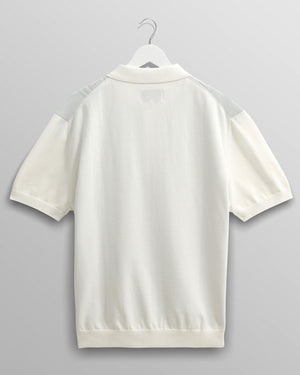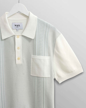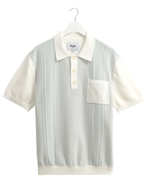 The Turnin is a turn up for the SS25 books. Cut for a relaxed fit and featuring a patch pocket, it's our modern take on the classic polo shape. This version features a blue and ecru colour blocked retro sport design with textured stripes running down both sides of the body.