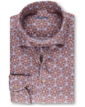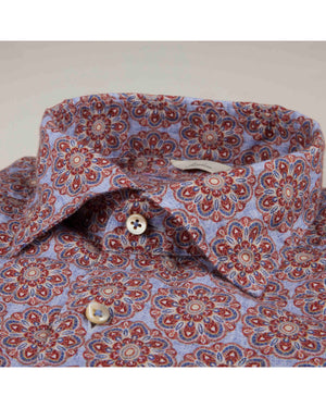 Red casual shirt, in fitted body, made in 100% linen. Designed with mother of pearl buttons, single cuffs, and a cutaway collar.