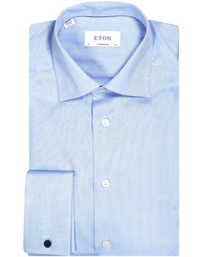 The Eton Contemporary Fit Double Cuff Shirt in Blue boasts a modern fit, cut away collar, and French cuffs. Elevate your style with this sophisticated shirt that delivers a sleek, tailored look. Perfect for any formal occasion, this shirt exudes confidence and class.