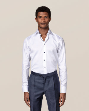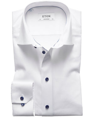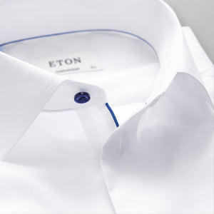 Suited for any occasion, this dress shirt is cut from Eton's beloved signature twill. Updated with piping inside the front placket and contrast buttons for a sophisticated and sleek look.The fabric's cotton creates a perfect balance between suppleness, structure and luster. This iconic Eton material, perfected over two decades, is simply made to last. Wear it with or without a tie. Pair it with a black or navy suit and a complementary tie for a sleek and professional look.