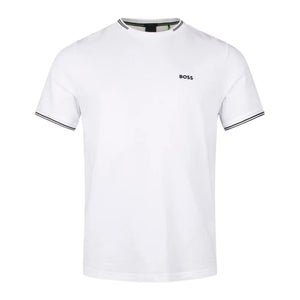 The BOSS Taul T-Shirt combines understated sophistication with everyday practicality. Made from a soft cotton-rich fabric, this regular-fit essential features a timeless crew neck and short sleeves perfect for year-round wear. The crisp white base is enhanced by striking black contrast trims along the collar and cuffs, creating a polished aesthetic. Signature BOSS branding on the chest completes the refined look, making it an ideal foundation piece for any wardrobe.