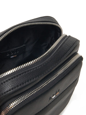 Experience convenience and style with the BOSS 'Ray' Crossbody bag. This sleek black bag features two zip pockets on the front for easy organization, and closes securely with a zipper. The adjustable shoulder strap, with a length of approximately 90-150 cm, allows for comfortable wear. Accented with polished silver metal fittings, this bag is a must-have for any fashion-forward individual.