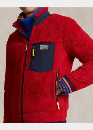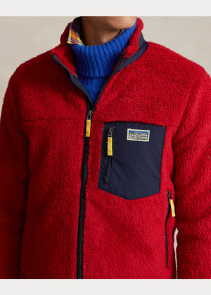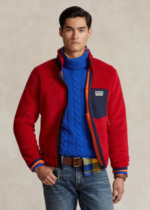 This cozy layer combines bonded high-pile fleece with sleek woven trim for an outdoors-inspired look.