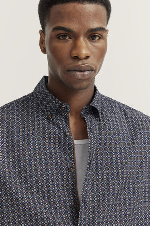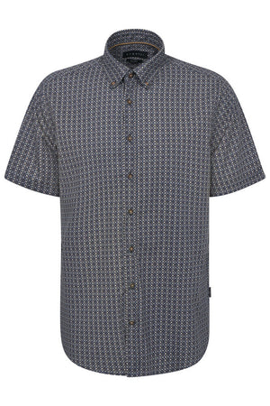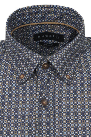 Expertly crafted with a short sleeve design and button down collar, the Bugatti Square Pattern Short Sleeve Short in navy boasts a unique square pattern and contrast colour buttons for a sophisticated touch. Elevate your style game with this versatile piece.