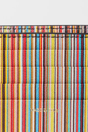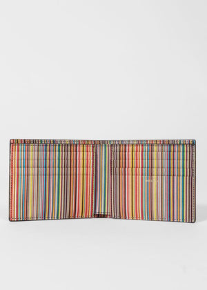 Made in Italy, this wallet contains eight credit or business card slots, two smaller compartments for extra storage and a large compartment for notes and receipts. This wallet is complete with a colourful 'Signature Stripe' interior and is lined in black fabric. Complete with a gold foil embossed signature logo on the exterior. Presented in a black gift-box.